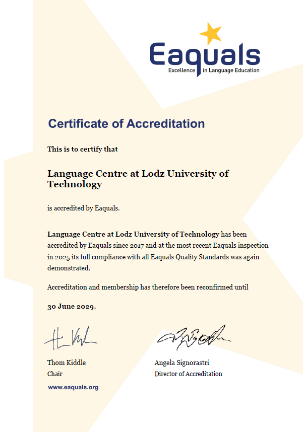 Centrum Językowe Politechniki Łódzkiej po raz kolejny udowodniło, że standardy nauczania języków obcych na naszej uczelni należą do światowej czołówki. Po rygorystycznej inspekcji przeprowadzonej w dniach 27-28 października 2025 przez międzynarodową organizację Eaquals, jednostka otrzymała potwierdzenie akredytacji, uzyskując znakomite wyniki w wielu kluczowych obszarach.